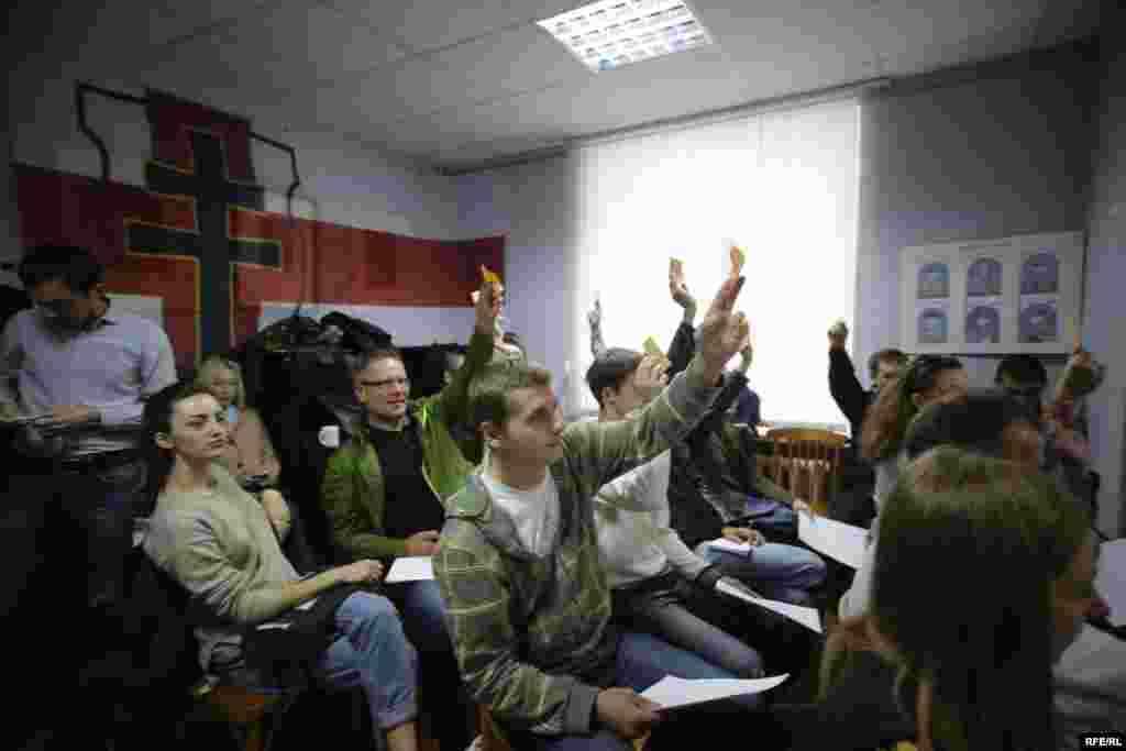 Спачатку маладафронтаўцы хацелі прыняць рэзалюцыю «Байкот „выбарам“». Але потым вырашылі зьмяніць фармулёўку на «„Выбарам“ — ігнор». «Заклікаем усіх кандыдатаў, якія лічаць сябе апазыцыйнымі, зьняцца з выбараў. Усіх, хто працягвае ўдзел у цырку Лукашэнкі — Ярмошынай, „Малады Фронт“ уважае за марыянэтак дыктатуры», — гаворыцца ў рэзалюцыі.