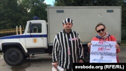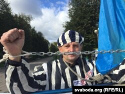 Рыгор Грык у часе пікету зладзіў пэрформанс — апрануў канцлягерную робу ды закавау рукі у ланцуг.