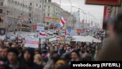 Калёна дэманстрантаў праходзіць скрыжаваньне праспэкту Незалежнасьці з вуліцай Казлова — да плошчы Якуба Коласа застаецца адзін квартал.