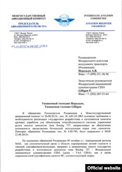Адпаведны ліст ад 4 лістапада ў адрас кіраўніка Расавіяцыі Аляксандра Нерадзько і намесьніка кіраўніка Фэдэральнай авіяцыйнай адміністрацыі ЗША (FAA) Маргарэт Гіліган размешчаны на сайце МАК і падпісаны старшынём Авіяцыйнага рэгістру МАК Уладзімірам Бяспалавым.