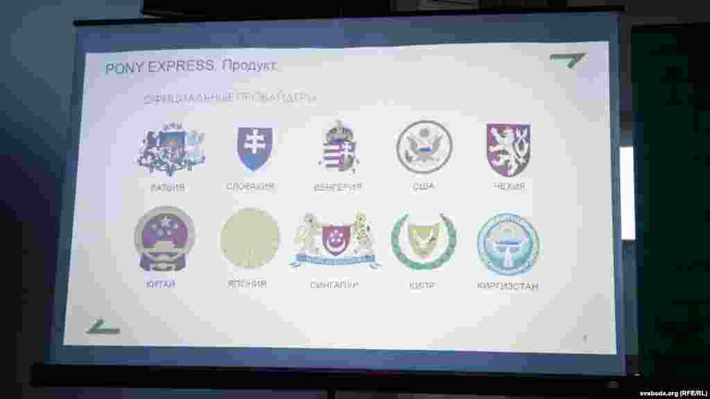 Генэральны дырэктар Pony Express у Беларусі Мікалай Герасімаў, амбасадар Маціньш Вірсіс, дырэктарка дэпартамэнту візавых сэрвісаў Pony Express Натальля Яўсеенка