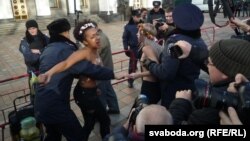 Прыйшлі да парлямэнту і дзьве актывісткі руху FEMEN, якія распрануліся са скандаваньнем «Стоп гамафоб!» — пасьля чаго былі затрыманыя супрацоўнікамі МУС.
