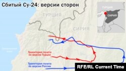 Расейскі Су-24 быў зьбіты турэцкім зьнішчальнікам F-16 раніцай 24 лістапада на турэцка-сырыйскай мяжы. Турэччына сьцьвярджае, што бамбавік парушыў яе паветраную прастору і праігнараваў неаднаразовыя папярэджаньні. Міністэрства абароны Турэччыны апублікавала аўдыёзапіс, на якім, як яно сьцьвярджае, турэцкія вайскоўцы просяць расейскі бамбавік зьмяніць свой курс.