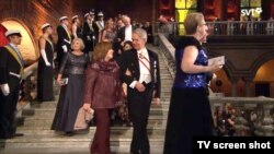 Зьлева ад Алексіевіч — Свантэ Лінквіст, рыксмаршал (кіраўнік прыдворнага ведамства) Швэцыі, а па правую руку ад пісьменьніцы — Міхаэль Сольман, былы выканаўчы дырэктар Нобэлеўскага фонду.