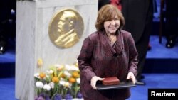 На банкеце ў Блакітнай залі Стакгольмскай ратушы першая беларуская нобэлеўская ляўрэатка згадала Адамовіча і Быкава і расказала сьвету пра Беларусь. ВІДЭА