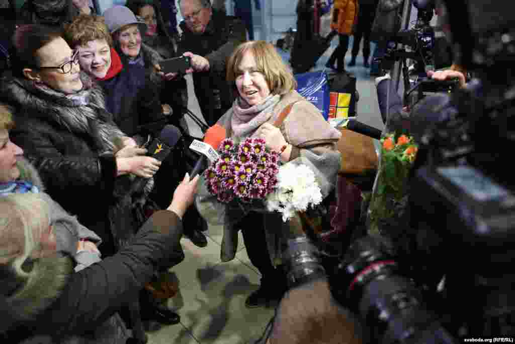 «Такога ніколі не было – каб так цёпла віталі людзі і цалкам ігнаравала дзяржава», сказала расчуленая пісьменьніца пасьля выхаду з залі прылётаў.