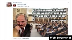 «На яго старонцы разьмешчаная інфармацыя, якая абражае годнасьць іншага чалавека. Я папрасіў Алега прыбраць гэтую інфармацыю. Да „Пагоні“ я стаўлюся абсалютна раўнадушна і адэкватна. Я лічу яе гістарычным фактам. На мяне „Пагоня“ ня дзейнічае як чырвоная ануча на быка. А тое, што ён на сваёй старонцы абразіў іншага чалавека, гэта кепска, я папрасіў гэта прыбраць. Таксама я папрасіў не рабіць рассылку розных відэаролікаў настаўнікам нашай школы».