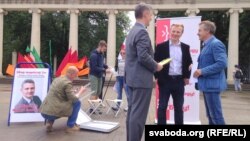 Анатоль Лябедзька, Віталь Рымашэўскі і Юрась Губарэвіч зладзілі каля цэнтральнага ўваходу ў Батанічны сад супольны пікет, падчас якога расказалі журналістам і мінакам пра мэты свайго ўдзелу ў выбарах.