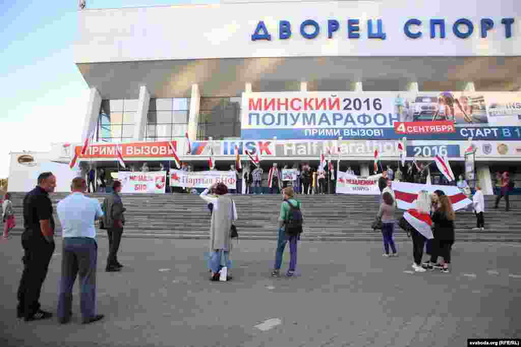 Каля менскага Палаца спорту адбыўся пікет Партыі БНФ. Некалькі дзясяткаў чалавек выйшлі пад бел-чырвона-белымі сьцягамі.