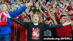 Многія заўзятары былі ў майках з «Пагоняй», а на трыбунах часта зьяўляліся бел-чырвона-белыя сьцягі.