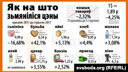 Кіляграм цукру прадаецца за 1,75 рубля (у студзені было 1,69), літар малака «Савушкин продукт» тлустасьцю 2,5% — 1,34 (у студзені каштаваў 1,3), дзясятак яек «Разумны выбар» С-1 прадаюць за 1,96 рубля, а не за 1,91, як у студзені.