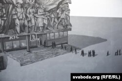 На ўсім гэтым будынку напісаная лічба 2017 — усё гэта адбываецца тут і цяпер. У самім гэтым будынку з барэльефам быў Дом модаў. Летась там унізе адкрылася сеткавая рэстарацыя хуткага харчаваньня KFC. Для мяне гэта неверагодны кантраст: людзі зьверху салідарна ідуць на гледача. А пад ім сьвеціцца нэон розных банкаў, крамаў, піцца, аптэка, Рублёўскі. Гэта такі вобраз капіталізму.