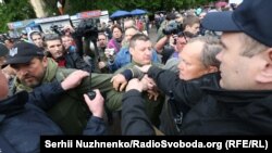Удзельнікі маршу ідуць па праезнай частцы, аддзеленыя кардонам паліцыі, і выкрыкваюць: «Фашызм ня пройдзе!»