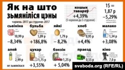 Свабода працягвае штомесячны маніторынг цэнаў у Беларусі на самыя неабходныя тавары. Мы адсочваем, колькі каштуюць у пачатку кожнага месяца 7 прадуктаў харчаваньня (сьвініна, бульба, яйкі, хлеб, малако, алей і цукар), а таксама аўтамабільнае паліва, праезд у грамадзкім транспарце і квіток у кінатэатар.