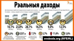 У Берасьцейскай вобласьці ў сярэднім у траўні зараблялі 679,9 рубля, у Віцебскай — 678,9 рубля, у Гомельскай — 712,1 рубля, у Гарадзенскай — 684,7 рубля, у Менскай — 810,1 рубля, у Магілёўскай — 673,9 рубля. Такім чынам, толькі ў сталіцы сярэдні заробак дасягнуў абяцаных 500 даляраў.