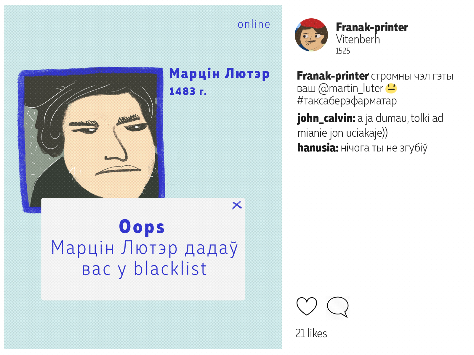 Францішак Скарына падарожнічаў ня менш за каторага сучаснага маладзёна. Ураджэнец Полацку, ён аб'ехаў палову Эўропы*: ад Вэнэцыі да Масквы. Пакінуў сьлед ва ўнівэрсытэтах Польшчы і Вэнэцыянскай рэспублікі, пры каралеўскіх дварах Даніі і Чэхіі. У Познані ён адседзеў у астрогу, а з Саксоніі ад яго ўцякаў Марцін Лютэр. Мы падумалі, што Скарына абавязкова карыстаўся б сацсеткамі. І вось як мог бы выглядаць ягоны інстаграм.