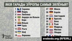Затое Менск зелянейшы за Бэрлін (30), Брусэль (34а), Вену (35), Рым (36), Мадрыд (37), Маскву (38), Лёндан (39) і Парыж (41).