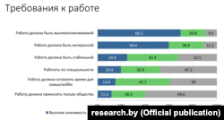 Для большасьці рэспандэнтаў самы важны крытэр, які прад’яўляецца да працы, — гэта высокія заробкі (69,2%). 59,4% лічаць, што праца павінна быць цікавай. Найменш значны крытэр — праца павінна прыносіць карысьць грамадзтву (11,6%).