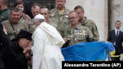 Папа Францішак зьвярнуўся да дэлегацыі ўкраінскіх вайскоўцаў, якая прыняла ўдзел у аўдыенцыі на плошчы сьв. Пятра ў Ватыкане.