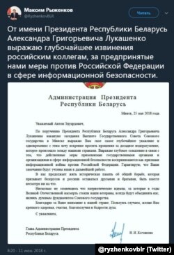 Зранку 11 чэрвеня ў акаўнце Максіма Рыжанкова, закінутым з восені 2016 году, зьявіліся выбачэньні «расейскім калегам за прынятыя меры супраць Расейскай Фэдэрацыі ў сфэры інфармацыйнай бясьпекі» з далучаным фота ліста, падпісанага нібыта кіраўніком адміністрацыі прэзыдэнта. За што менавіта «прасілі прабачэньня», зь ліста не зразумець.