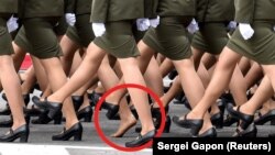 Але на парадзе здарылася нечаканасьць, якую зафіксаваў фотакарэспандэнт агенцтва Reuters — перад трыбунай з кіраўніцтвам краіны адна дзяўчына шпацыравала басанож. Адна туфля, хутчэй за ўсё, саскочыла з нагі, як у казцы пра Папялушку, але дзяўчына ішла далей без абутку. Калі прыгледзецца да здымку, відаць, што над пяткай і яшчэ ў двух месцах на назе ў дзяўчыны налеплены плястыр.