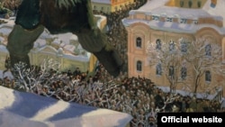 Ветрык трапаў разьвешаныя над пляцам шырокія сьцягі, высоўваліся наперад хаткі, што несьлі на сабе плякаты з падпаленымі гарадамі. Хатка за хаткай. I ў ранішняй шэрасьці паўсюдная чатырохкутная чырвань бянтэжыла спакой і сьвет і неяк глыбока палохала, нібы пралітай крывёю: