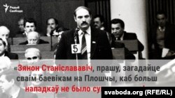 «Паважаныя члены Вярхоўнага Савету! Паважаны Станіслаў Станіслававіч! Я вас вельмі прашу ўважліва мяне выслухаць, я больш трох хвілін вашу ўвагу не займу. Перш чым па сутнасьці сказаць, я б хацеў зьвярнуцца да вас, Зянон Станіслававіч Пазьняк, як да чалавека, перад якім я абсалютна ні ў чым не вінаваты, і папрасіць, каб вы ці сваім “баевікам”, ці сваёй “шпане”, ня ведаю, як вы яе называеце, загадалі, каб больш... (Шум у залі). Вы мяне, калі ласка, не перапыняйце, я ў тры хвіліны ўкладуся. Калі ўчора Антончык выступаў з трыбуны, вы яму далі сказаць. І я вам скажу, Станіслаў Станіслававіч, чаму я гэта кажу. Таму вы, калі ласка, папярэдзьце сваіх людзей: крычаць, калі ласка, крычыце, але нападкі прадпрымаць супраць народных дэпутатаў, я маю на ўвазе перш за ўсё супраць мяне... Таму я вас вельмі прашу, як чалавека, разьбярыцеся з тымі, каго вы ўчора прывялі на Плошчу. І вось тут сядзіць старшыня КДБ, калі гэта правакацыя, ён вам, спадар Баршчэўскі, скажа... Гэтая заява была ад трэцяга мікрафона не выпадковая, што вы там раздасьцё тэлефоны і пачняце камусьці пагражаць. Я асабіста вас не баюся».