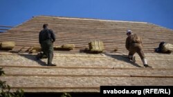 Цяпер рабочыя перакрываюць дах. Старую дахоўку зьнялі раней, а замест яе кладуць сьвежыя драўляныя гонты — пласьціны 70×12 сантымэтраў. З фасаднай часткі дах ужо пераклалі.