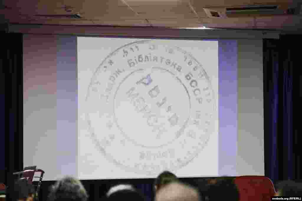 Лексыкограф Алесь Астравух дэманструе герб БССР, на якім прысутнічаў ідыш