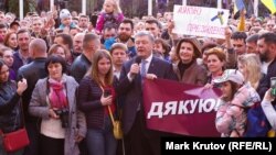 У Кіеве каля будынка Адміністрацыі прэзыдэнта Ўкраіны прайшла акцыя «Дзякуй, Пятро» на знак падзякі за рэформы, праведзеныя прэзыдэнтам Пятром Парашэнкам на працягу знаходжаньня на пасадзе кіраўніка дзяржавы, паведамляе Інтэрфакс-Украіна.