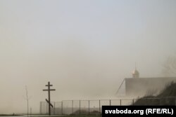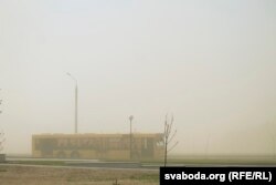 Пылавая бура накрыла Горадзеншчыну 24 красавіка. За клубамі пылу цьмяна відаць дамы і нават неба.