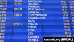 На табло Нацыянальнага аэрапорту «Менск» лацінкаю сталіца Ўкраіны пазначаная як Kyiv, а Львоў — Lviv. Так украінскія гарады пішуцца ўжо некалькі гадоў.