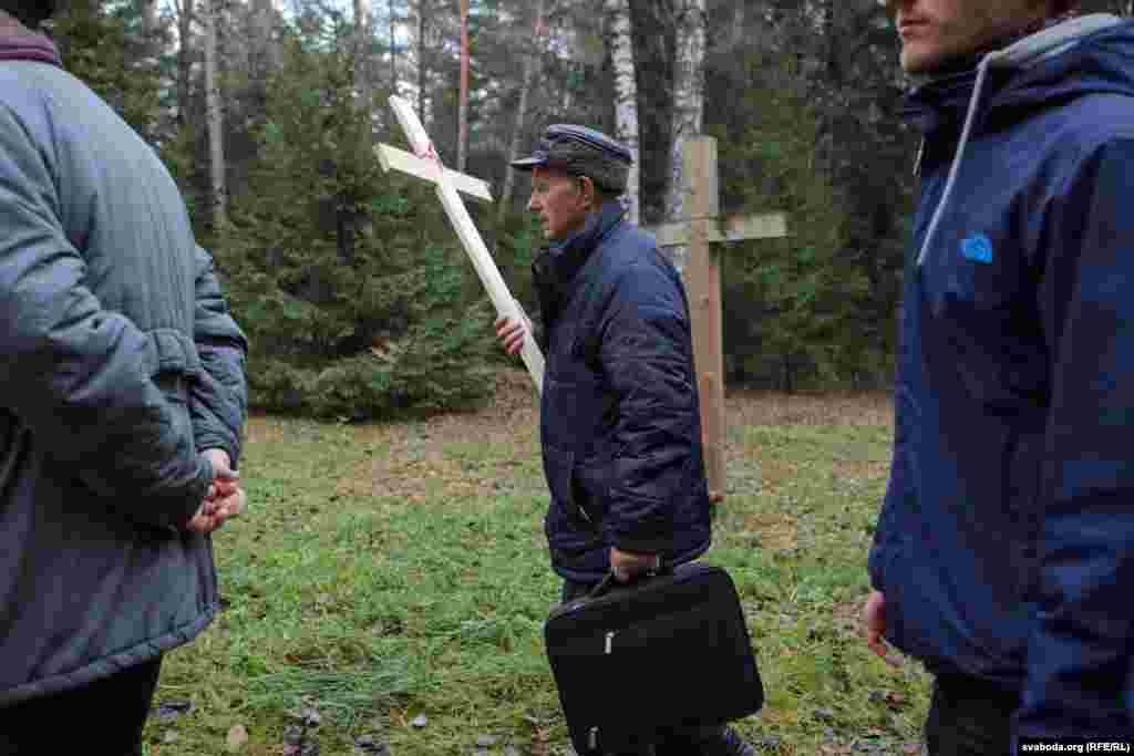 Актывіст Кансэрватыўна-хрысьціянскай партыі БНФ Валер Буйвал нясе крыж ў Курапаты