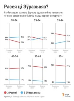 Раней эўрапейская дамінанта назіралася толькі ў групе самых маладых рэспандэнтаў — 18-24 гадоў. Зараз упершыню за ўвесь пэрыяд вымярэньняў дадалася наступная ўзроставая група — 25-34 гадоў, у якой праэўрапейская арыентацыя пераважае прарасейскую. І гэта фундамэнтальны зрух.