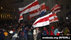 Удзельнікі сходу свабодных людзей, які пачаўся а 18-й гадзіне на плошчы Свабоды ў Менску, прыйшлі на плошчу Незалежнасьці да будынку Цэнтравыбаркаму.