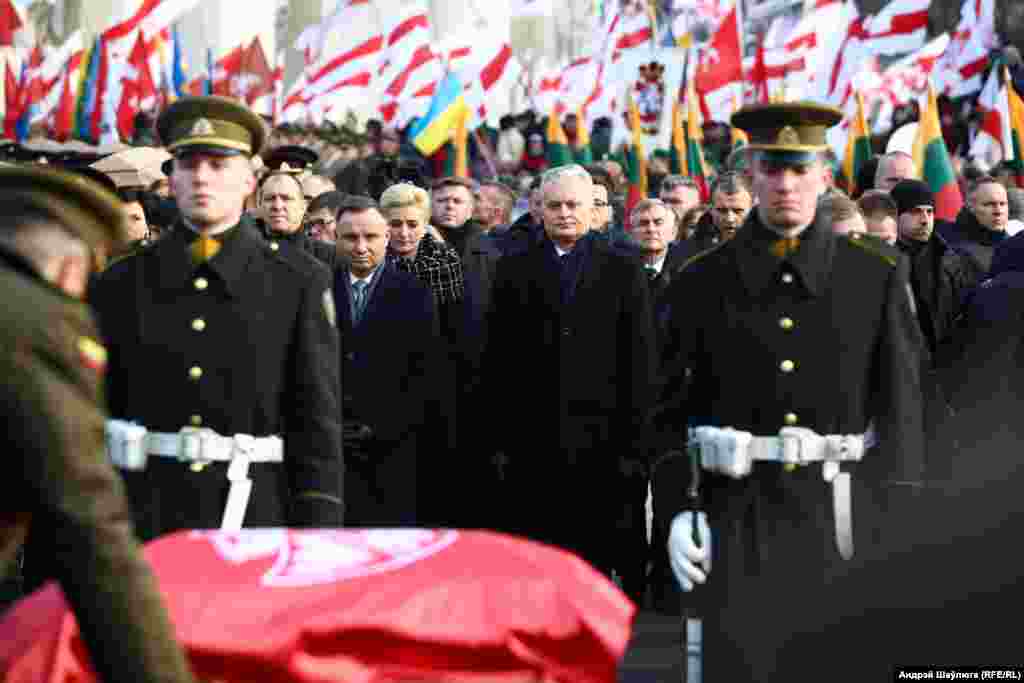 Прэзыдэнт Польшчы Анджэй Дуда (зьлева) цісьне руку прэзыдэнту Літвы Гітанасу Наўседу