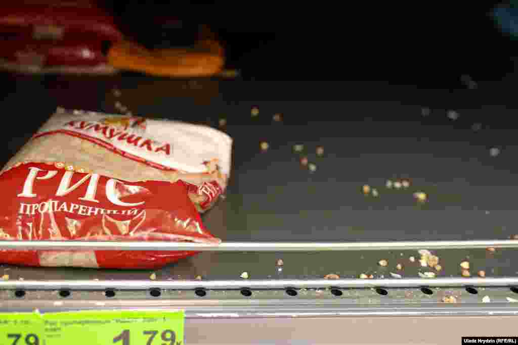 Больш за ўсё людзей цікавяць крупы, апусьцелі таксама паліцы з макаронай, рысам і чамусьці з манкай. Фотарэпартаж з Эўраопту на Казіміраўскай у Менску.