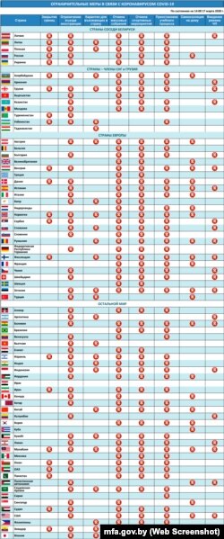 Міністэрства замежных справаў Беларусі выдала табліцу з параўнаньнем забаронаў, уведзеных у розных краінах сьвету ў сувязі з пандэміяй COVID-19.