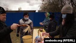 Людзей няшмат. Сталы ў двары паставілі так, каб захоўвалася «сацыяльная дыстанцыя». Генадзь прыехаў асьвяціць ежу — паскі і яйкі, з Марозавічаў. Ён зьбіраецца і на начную службу ў царкву. «І булкі пасьвяціць, і ў царкве пабыць — гэта традыцыя, ня трэба яе парушаць. У царкве я не баюся заразіцца — гэта сьвятое месца. Але меры засьцярогі буду прымаць. Я хоць і сівы, але жыць хочацца», — кажа Генадзь.