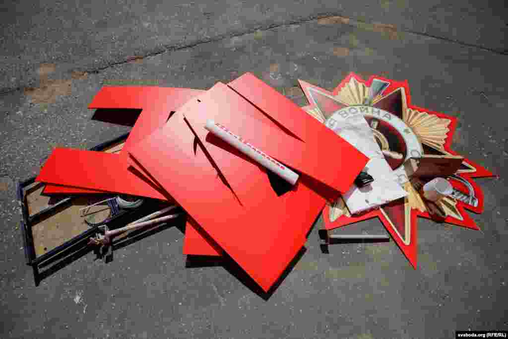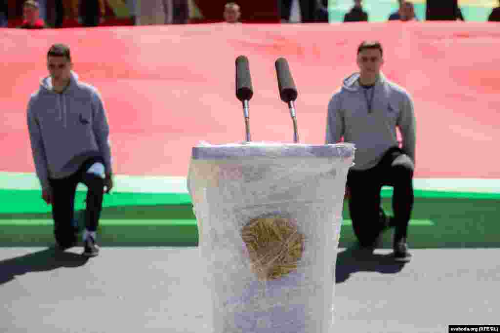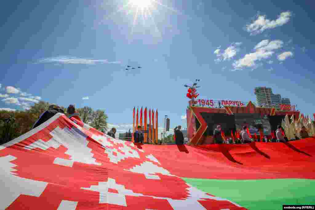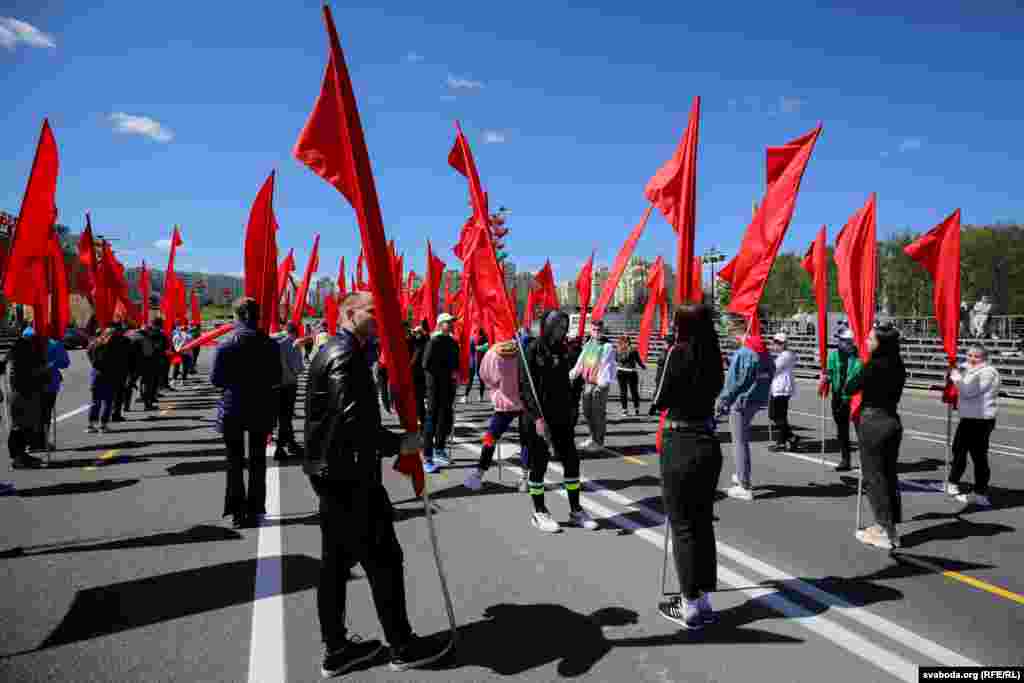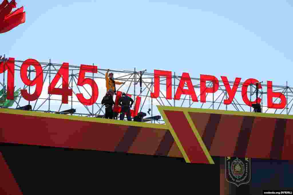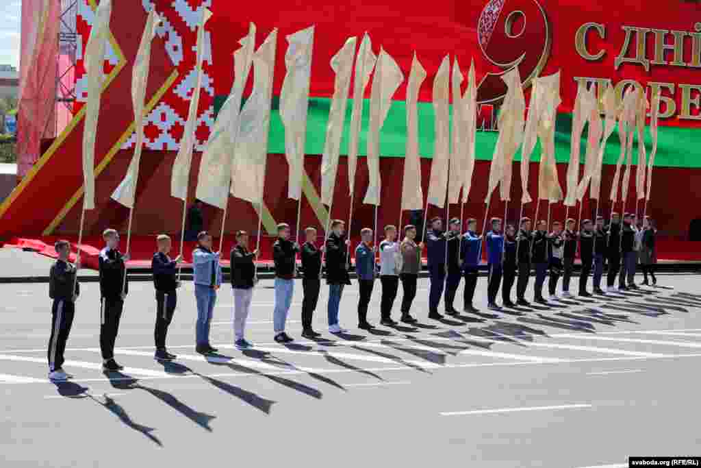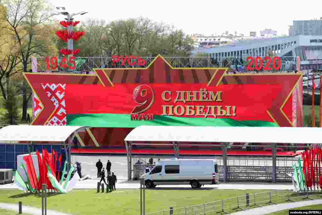 Прадстаўнікі некалькіх міністэрстваў прыехалі сёньня адначасова да стэлы «Мінск — горад-герой», каб ускласьці кветкі да помніка. У гэты ж момант на перакрытай праезнай частцы адбывалася рэпэтыцыя параду да 9 траўня з удзелам студэнтаў і творчых калектываў, а побач рабілі дэзынфэкцыю трыбунаў, дзе будуць стаяць чыноўнікі і Аляксандар Лукашэнка.