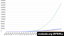 Так выглядае прырост агульных выпадкаў захворваньня на каранавірус у Беларусі і ў суседзяў у траўні: