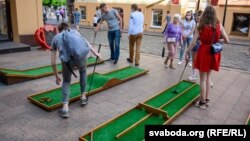 Побач працавала пляцоўка для міні-гольфу, нехта падбіваў мячы. Нягучна грала музыка. Пазнавальнымі былі песьні беларускага гурту, удзельніка Эўравізіі-2017 Naviband.