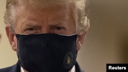 Трамп надзеў маску, калі прыехаў у Нацыянальны вайскова-мэдычны цэнтар у прыгарадзе Вашынгтона, каб наведаць параненых салдатаў і мэдыкаў, якія даглядаюць хворых на COVID-19.