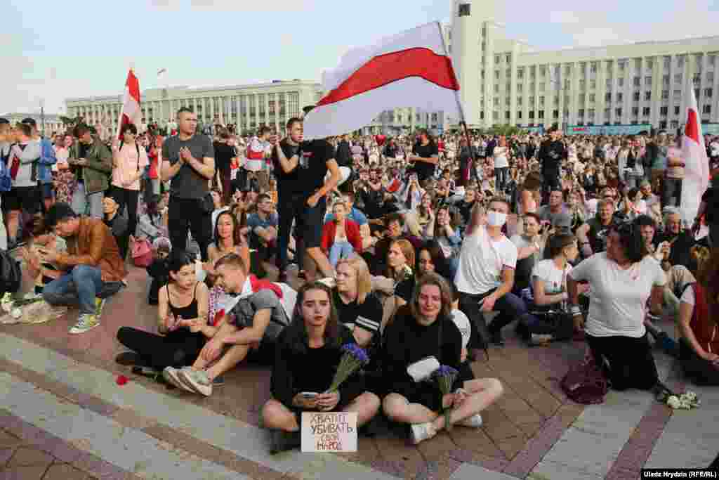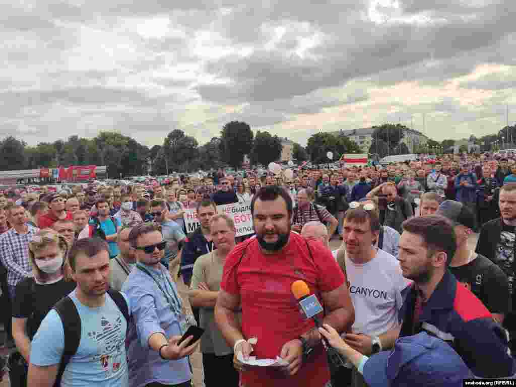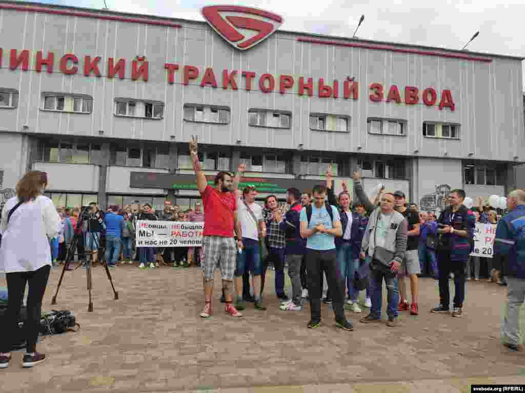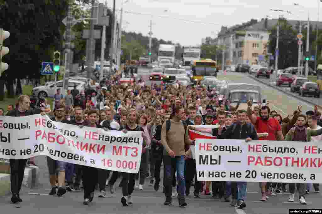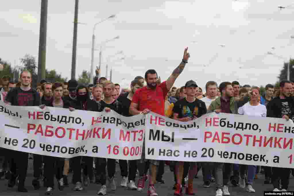 На пляцоўцы за прахадной Менскага трактарнага заводу (МТЗ) 14 жніўня адбыўся мітынг рабочых. На МТЗ прыехаў прэм’ер-міністар Раман Галоўчанка, але праігнараваў мітынгоўцаў на плошчы перад заводам і пайшоў да адміністрацыі МТЗ. Рабочыя пачалі марш да Дому ўраду. Вось як гэта было.