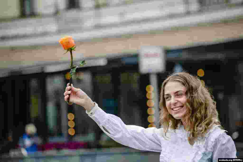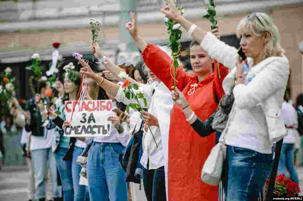 Людзі сталі ў «ланцуг салідарнасьці» на плошчы Перамогі ў Менску. Фотарэпартаж