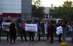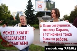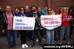 «Прэса — гэта сьвятое. Юры Караеў», «Свабоду журналістам», «Рабілі сваю працу — апынуліся на Акрэсьціна» — з такімі плякатамі прысутныя журналісты Tut.by, «Онлайнеру», «БелаПАН», «Нашай нівы» і іншых мэдыя сталі насупраць будынку МУС.