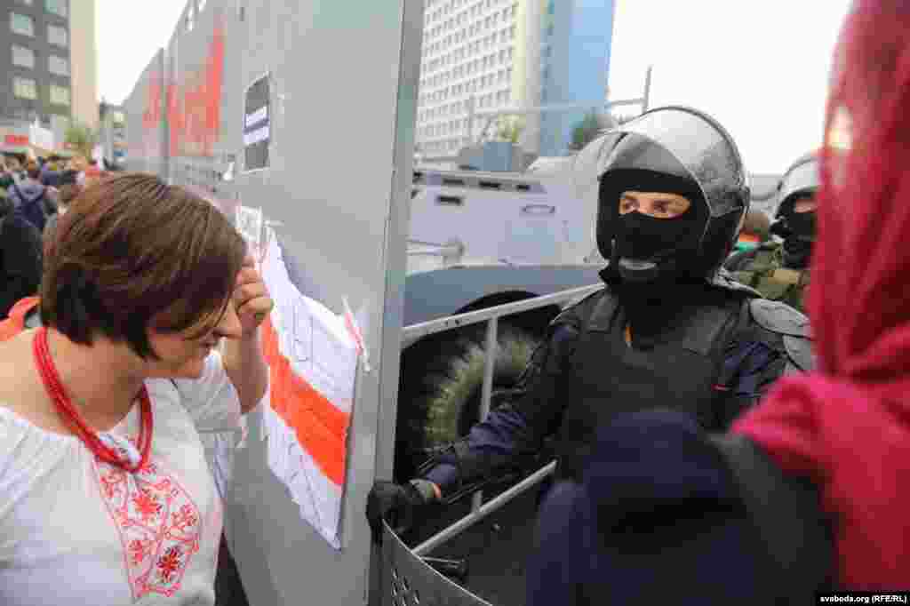 Пратэстоўцы пазуюць на фоне кардону спэцтэхнікі і сілавікоў
