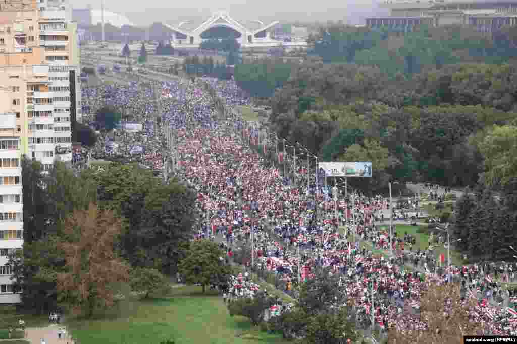 6 верасьня. «Марш адзінства» ў Менску. За натоўпам назіраюць прэс-сакратарка Аляксандра Лукашэнкі Натальля Эйсмант і Дзьмітры Паўлічэнка, экс-камандзір вайсковай часткі 3214, якога падазравалі ў зьнікненьні апанэнтаў рэжыму