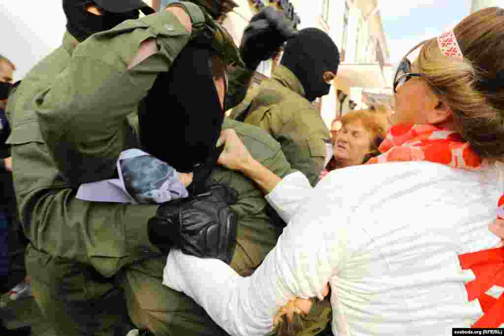 Хутка на плошчу Свабоды пад’ехалі мікрааўтобусы з танаванымі шыбамі і 5 аўтазакаў, сілавікі пачалі жорстка затрымліваць жанчын: некаторых валаклі па зямлі.