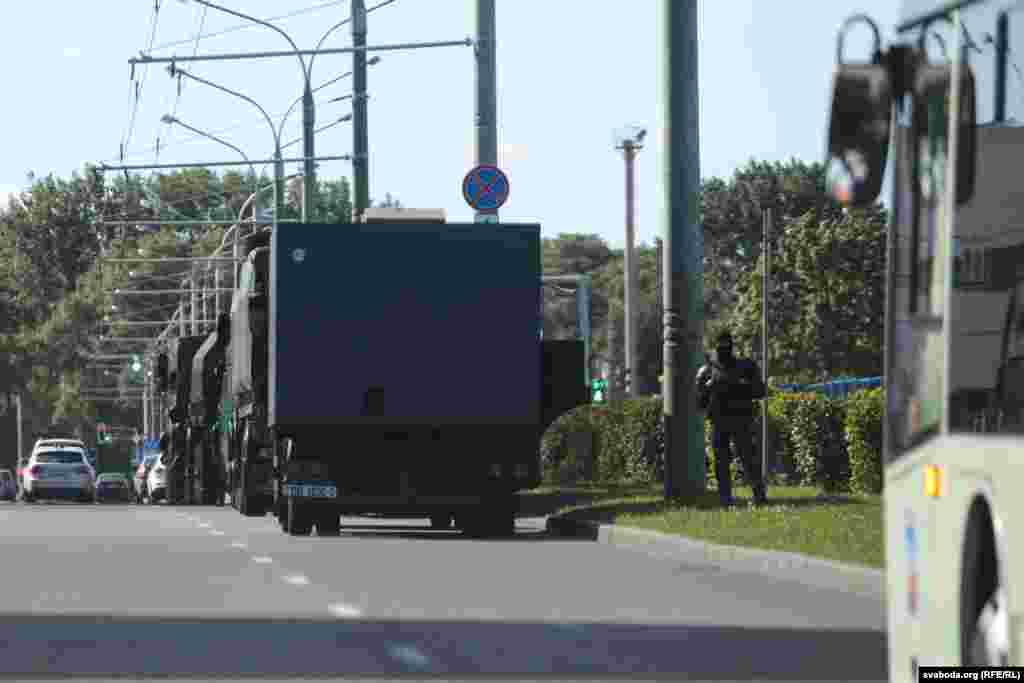 Сілавікі сталі ў кардоны са спэцтэхнікай на скрыжаваньні праспэкту Незалежнасьці і вуліцы Казлова, каб не пусьціць шэсьце да плошчы Перамогі